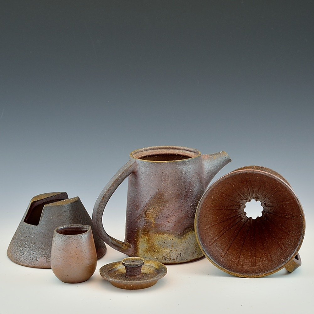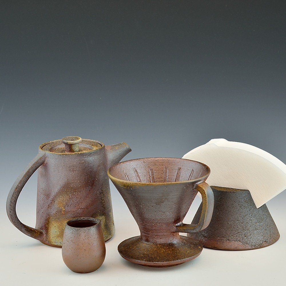 Coffee Dripper Pot Set. Hand crafted and signed by ceramic artist, Yosuke Kimura. Wheel formed and fired with red pine wood in the fire-clay brick kiln for 14 days. Unglazed, unpainted and all natural colors.Coffee Dripper: 18cm long, 18cm wide, 12cm high, Microwave- and dishwasher-safeThe colors and the patterns may vary as each item is a unique piece of art. If you would like more details about this item, please contact us.