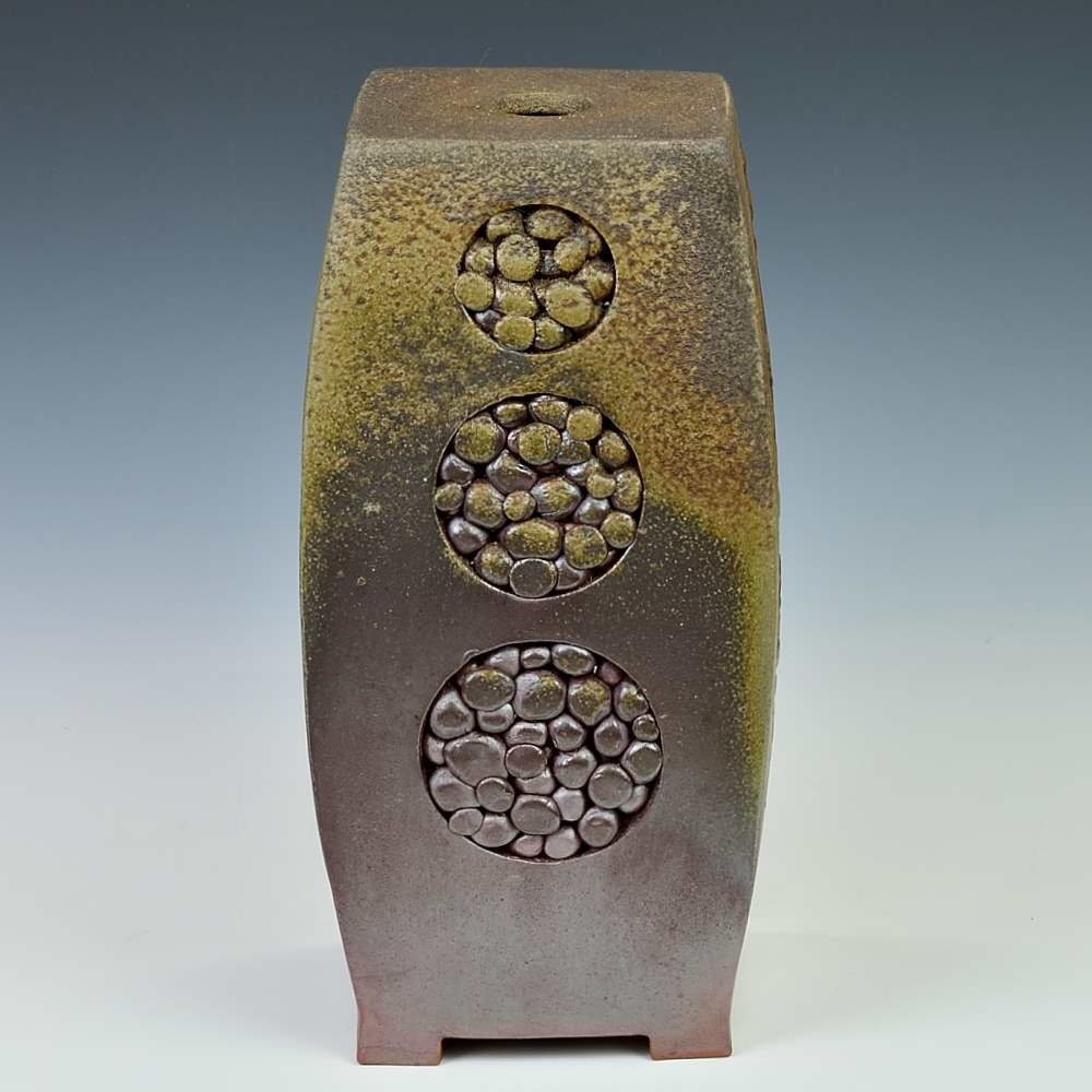 Lamp – Pebble Tower. Hand crafted and signed by ceramic artist, Yosuke Kimura. Hand formed and fired with red pine wood in the fire-clay brick kiln for 14 days. Unglazed, unpainted and all natural colors.Lamp: 13cm long, 13cm wide, 30cm high, The colors and the patterns may vary as each item is a unique piece of art. If you would like more details about this item, please contact us.