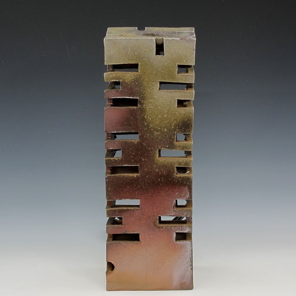 Lamp – Tower. Hand crafted and signed by ceramic artist, Yosuke Kimura. Hand formed and fired with red pine wood in the fire-clay brick kiln for 14 days. Unglazed, unpainted and all natural colors.Lamp: 10cm long, 10cm wide, 24cm high, The colors and the patterns may vary as each item is a unique piece of art. If you would like more details about this item, please contact us.