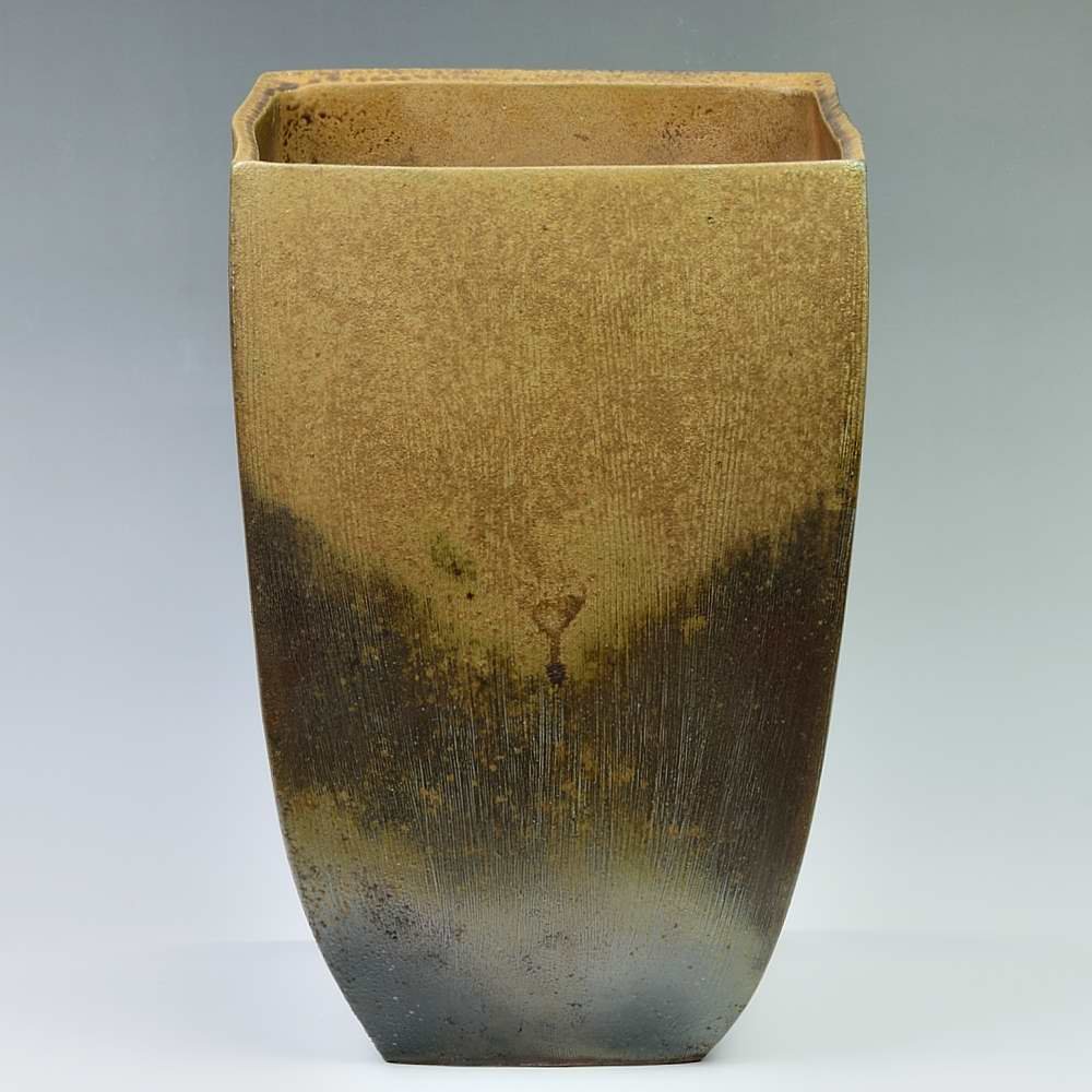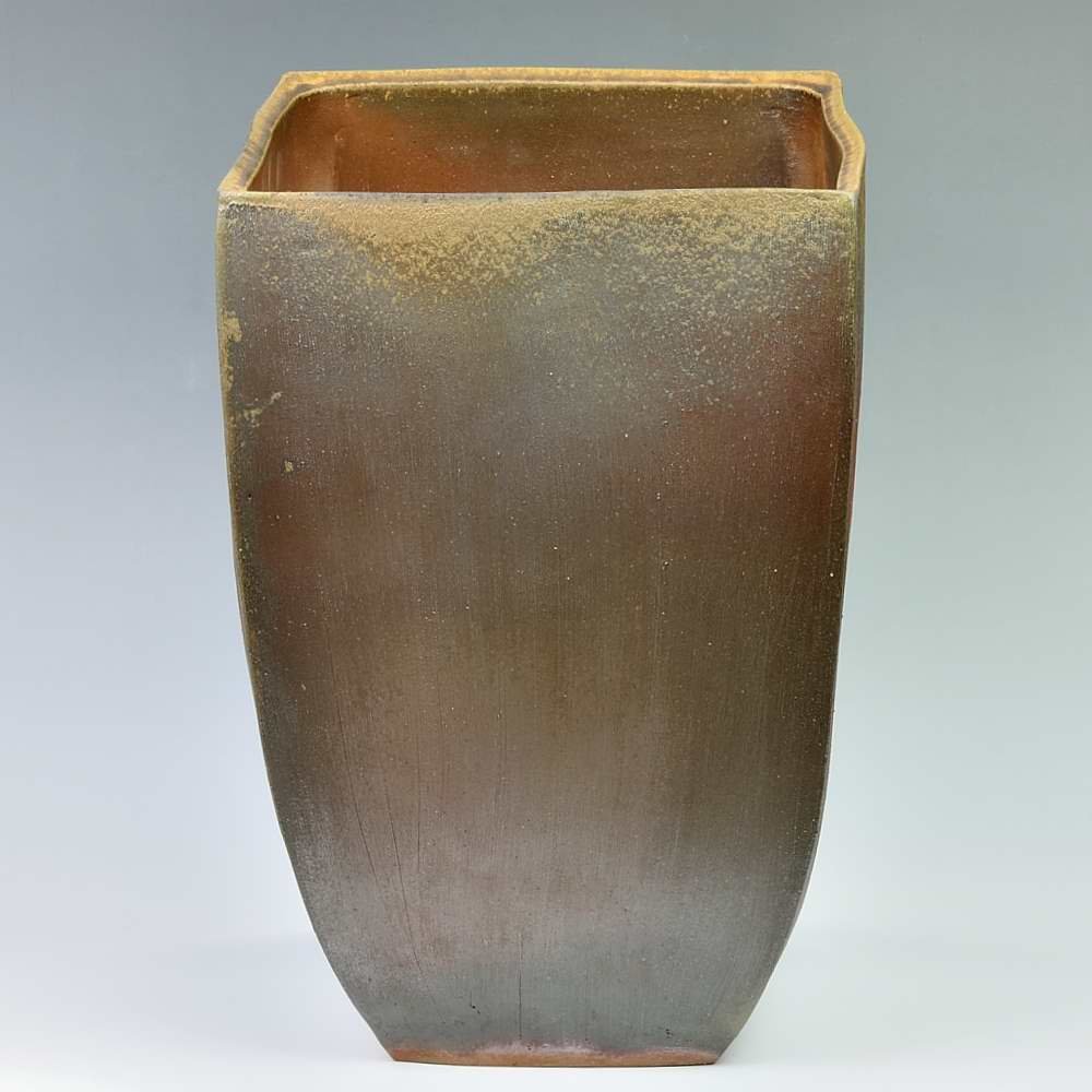 Square Taper Sculptural Vase. Hand crafted and signed by ceramic artist, Yosuke Kimura. Hand formed and fired with red pine wood in the fire-clay brick kiln for 14 days. Unglazed, unpainted and all natural colors.Flower Vase: 29cm long, 29cm wide, 43cm high, The colors and the patterns may vary as each item is a unique piece of art. If you would like more details about this item, please contact us.
