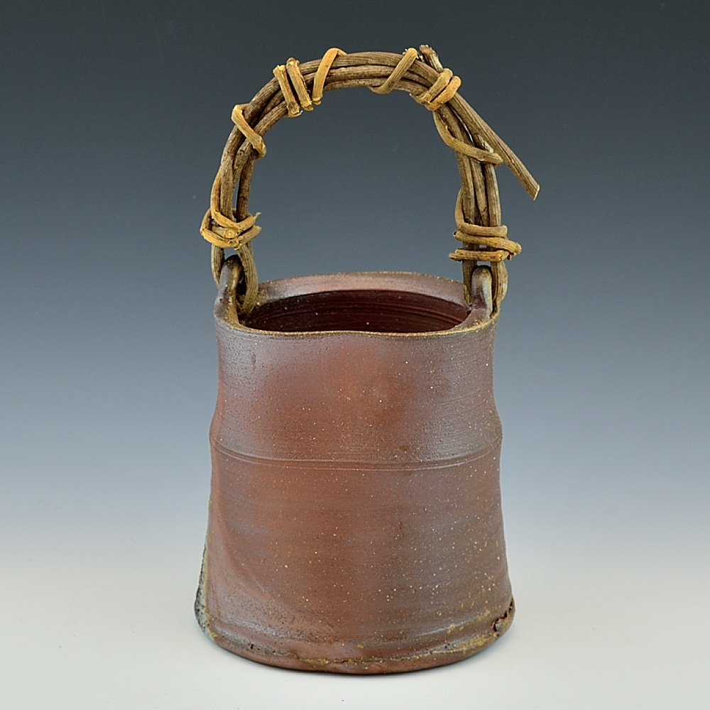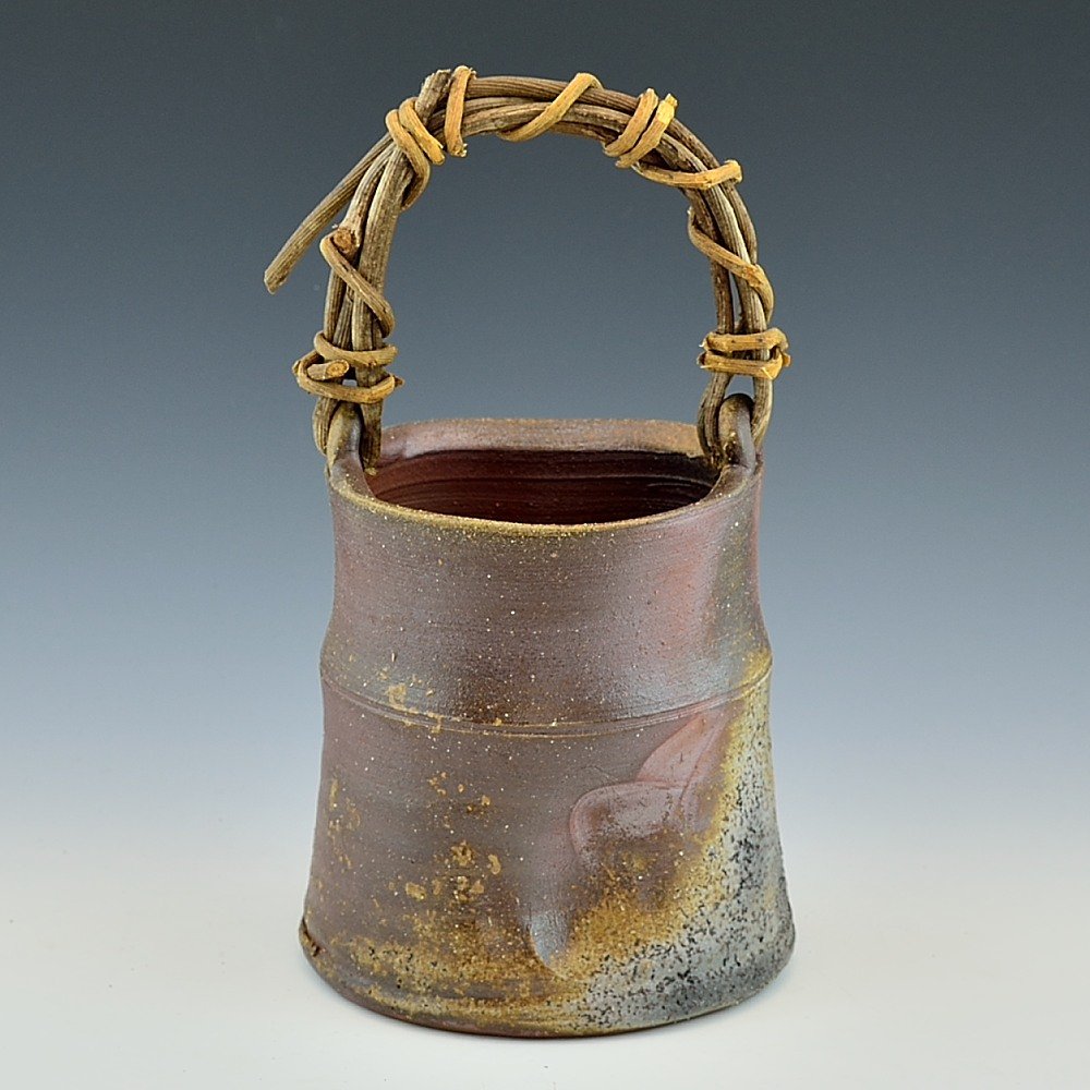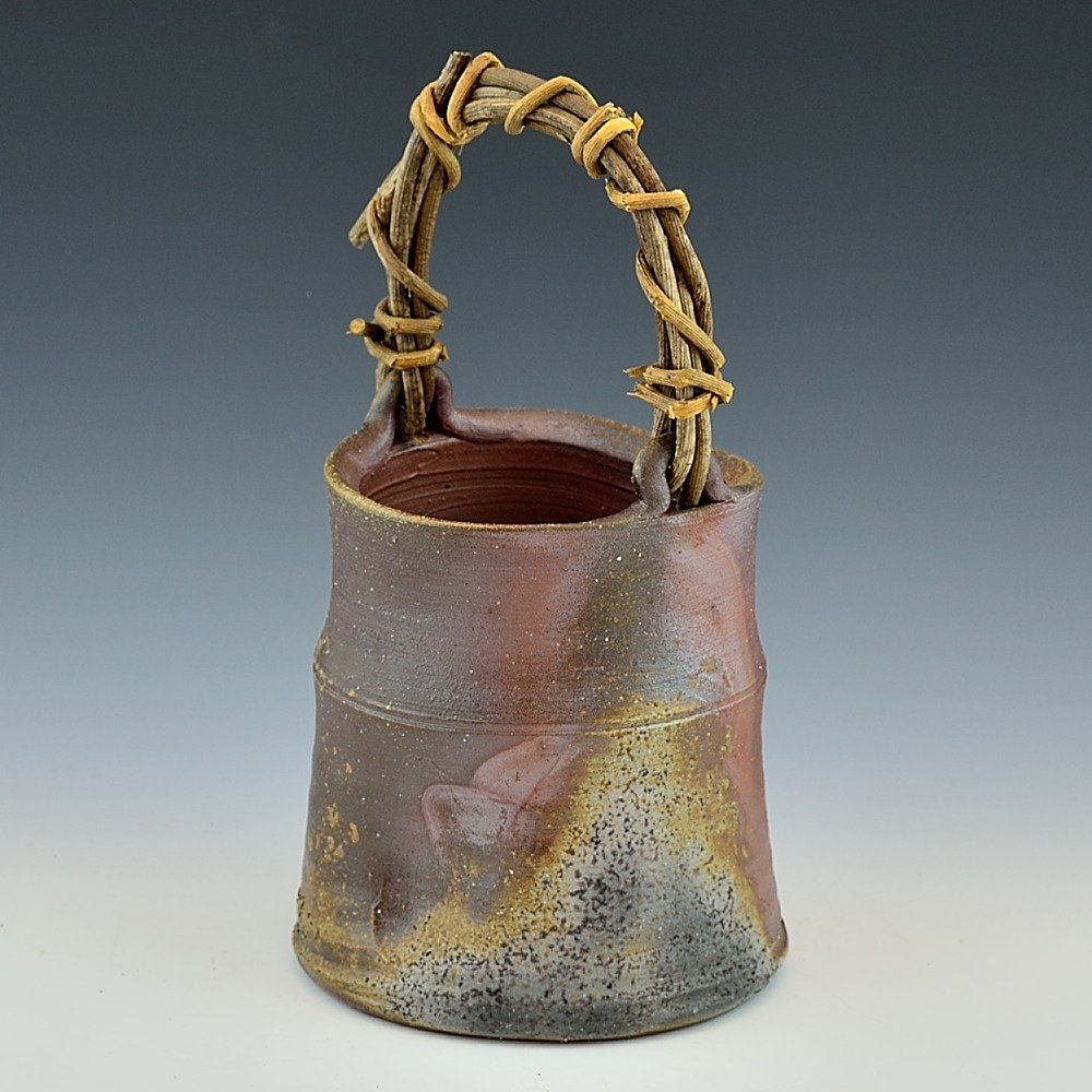 かずら手花入。木村微風によってろくろで作られ、作品の底には作家のサインが入っています。登り窯で赤松の割り木だけを使い、約2週間焼き締められました。釉薬は全く使われておらず、土と炎から生み出される自然の色をお楽しみください。花器: 直径13cm, 高さ約24cm, 備前焼は一点一点手作りのため、焼けや風合いが異なることが多少ございます。どうぞご了承ください。