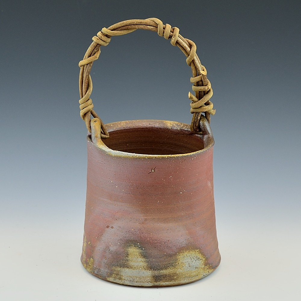 かずら手花入。木村微風によってろくろで作られ、作品の底には作家のサインが入っています。登り窯で赤松の割り木だけを使い、約2週間焼き締められました。釉薬は全く使われておらず、土と炎から生み出される自然の色をお楽しみください。花器: 直径13cm, 高さ約24cm, 備前焼は一点一点手作りのため、焼けや風合いが異なることが多少ございます。どうぞご了承ください。