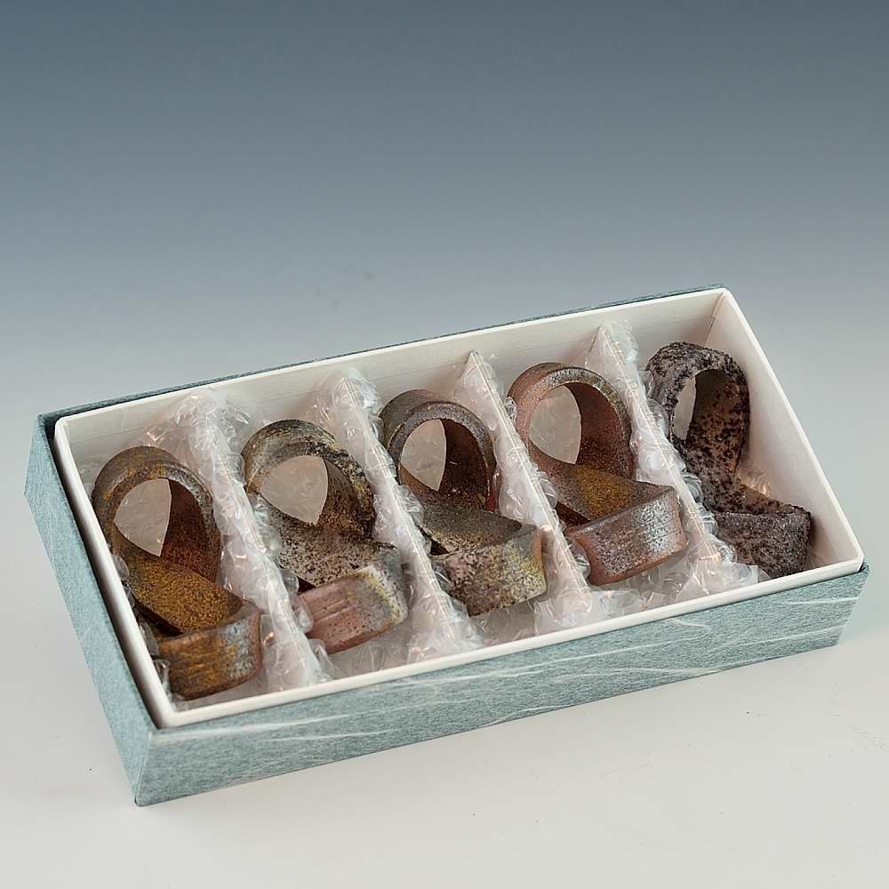 はし置セット(リボン)。木村庸祐によって手びねりで作られ、作品の底には作家のサインが入っています。登り窯で赤松の割り木だけを使い、約2週間焼き締められました。釉薬は全く使われておらず、土と炎から生み出される自然の色をお楽しみください。 はし置セット: 幅約16cm, 奥行約8cm, 高さ約3cm, はし置が5つのセットです。ギフトボックス付です。 電子レンジ・食器洗浄機対応 備前焼は一点一点手作りのため、焼けや風合いが異なることが多少ございます。どうぞご了承ください。