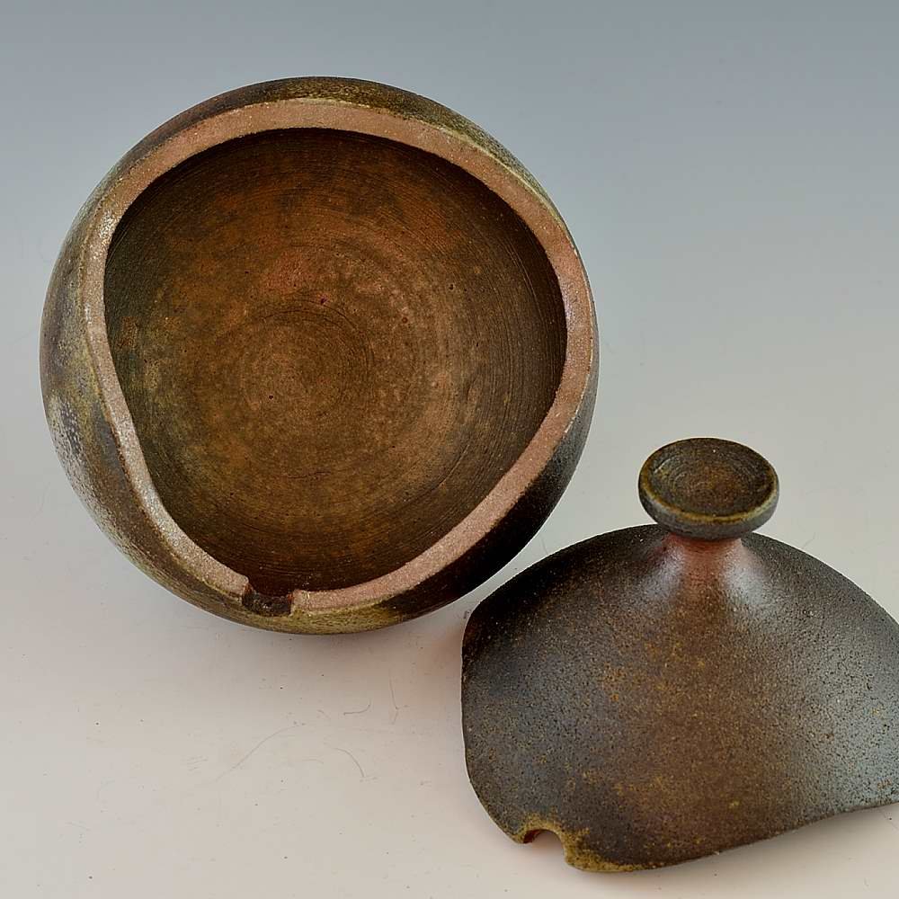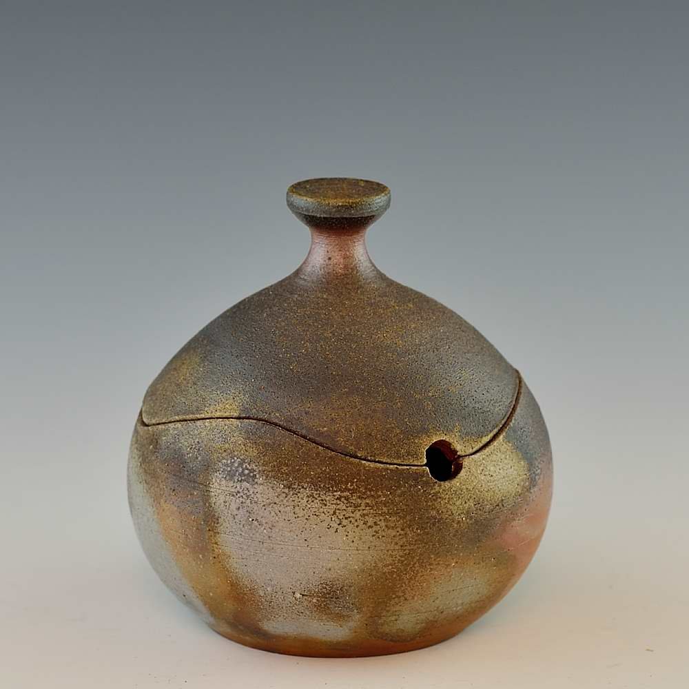 砂糖壷。木村微風によってろくろで作られ、作品の底には作家のサインが入っています。登り窯で赤松の割り木だけを使い、約2週間焼き締められました。釉薬は全く使われておらず、土と炎から生み出される自然の色をお楽しみください。 壷: 直径9cm, 高さ10cm, 電子レンジ・食器洗浄機対応 備前焼は一点一点手作りのため、焼けや風合いが異なることが多少ございます。どうぞご了承ください。