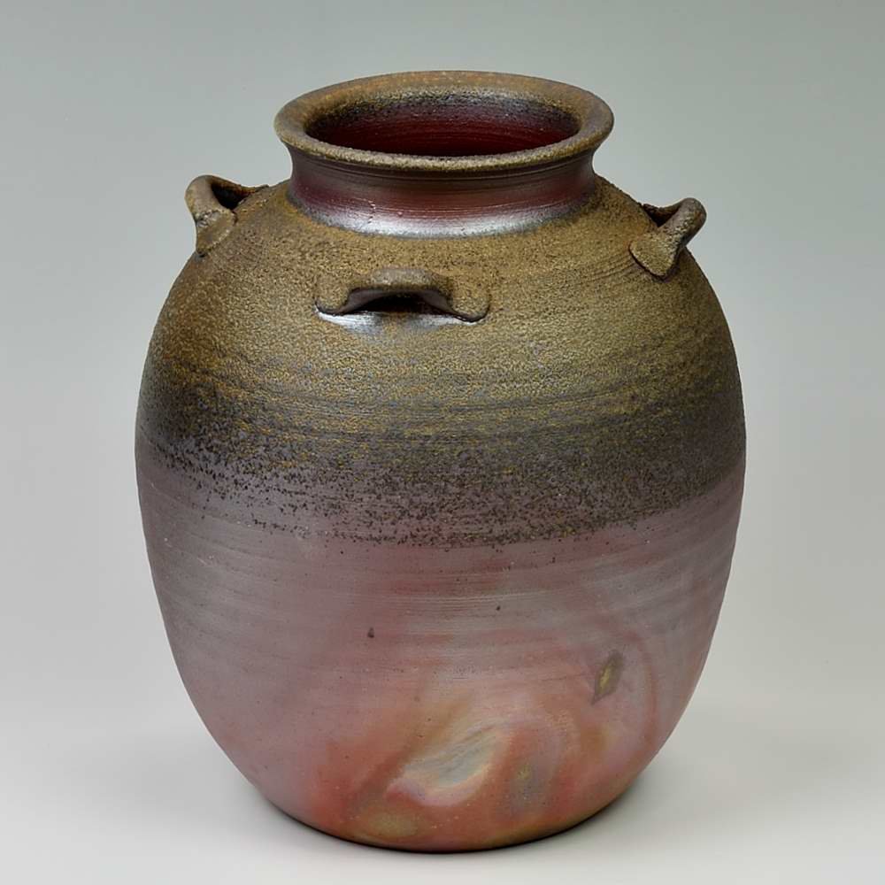 耳付き花入。木村微風によってろくろで作られ、作品の底には作家のサインが入っています。登り窯で赤松の割り木だけを使い、約2週間焼き締められました。釉薬は全く使われておらず、土と炎から生み出される自然の色をお楽しみください。花器: 直径19cm, 高さ約22cm, 備前焼は一点一点手作りのため、焼けや風合いが異なることが多少ございます。どうぞご了承ください。