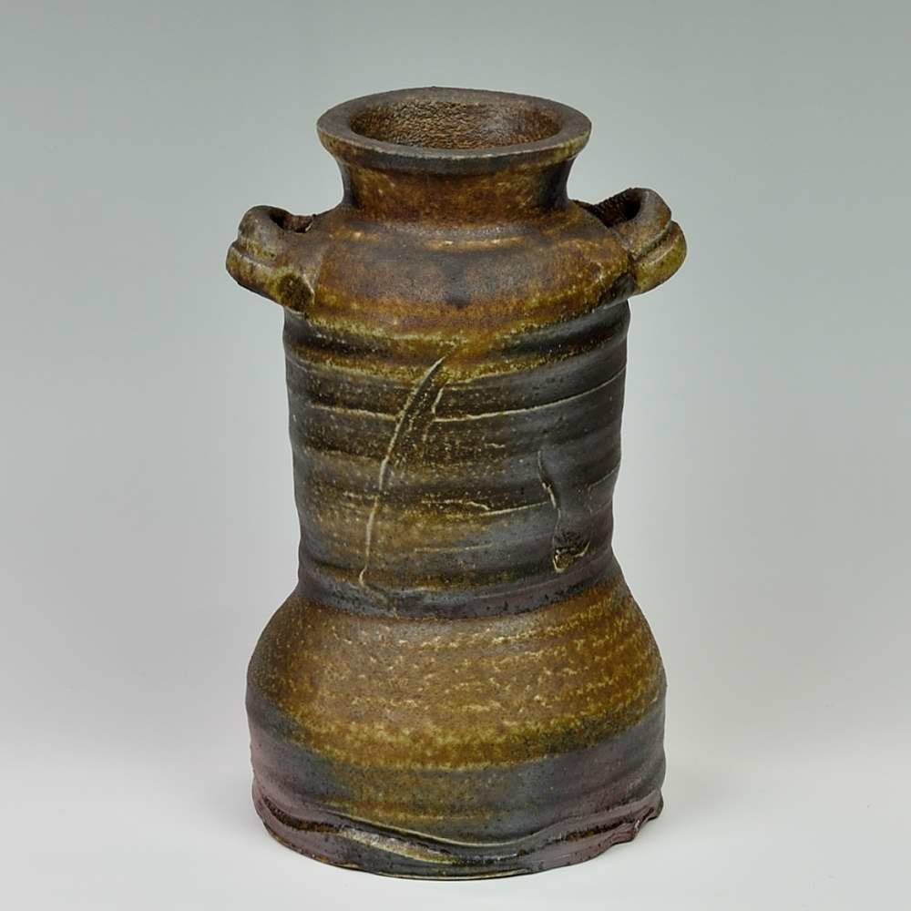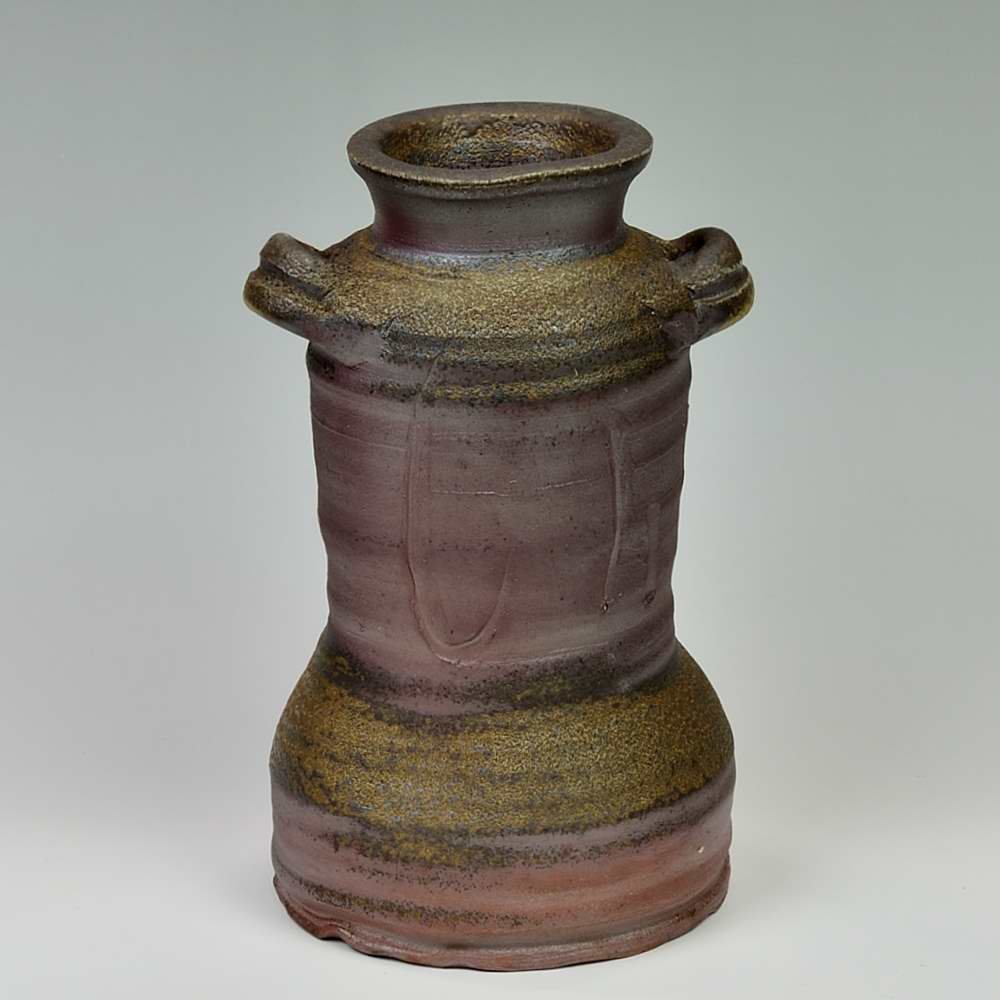 耳付き花入ープレミアム。木村微風によってろくろで作られ、作品の底には作家のサインが入っています。登り窯で赤松の割り木だけを使い、約2週間焼き締められました。釉薬は全く使われておらず、土と炎から生み出される自然の色をお楽しみください。花器: 直径12cm, 高さ約25cm, 備前焼は一点一点手作りのため、焼けや風合いが異なることが多少ございます。どうぞご了承ください。