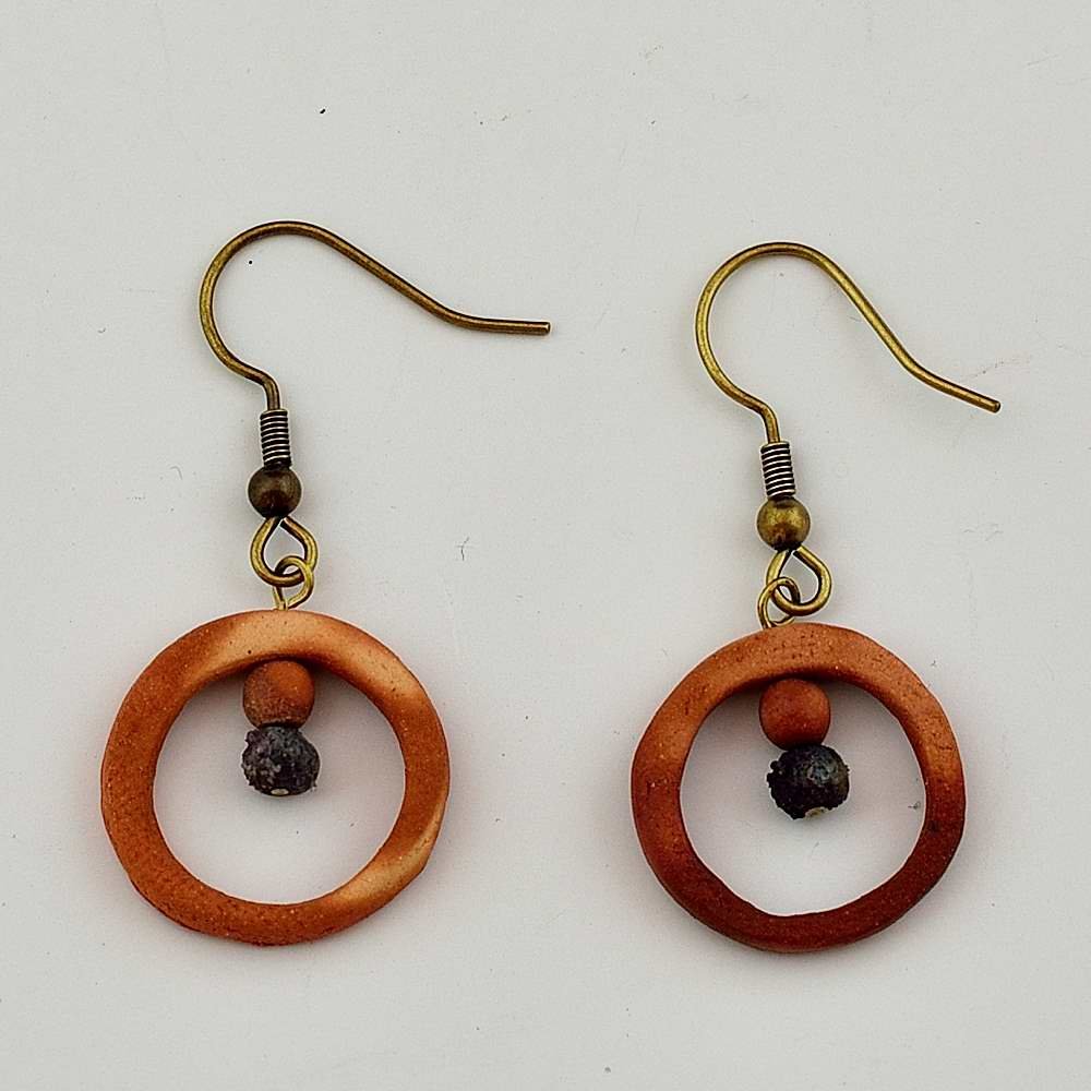 ピアス。木村微風によって手びねりで作られ、作品の底には作家のサインが入っています。登り窯で赤松の割り木だけを使い、約2週間焼き締められました。釉薬は全く使われておらず、土と炎から生み出される自然の色をお楽しみください。ピアス: 幅約1~3cm, 奥行約1~3cm, 備前焼は一点一点手作りのため、焼けや風合いが異なることが多少ございます。どうぞご了承ください。