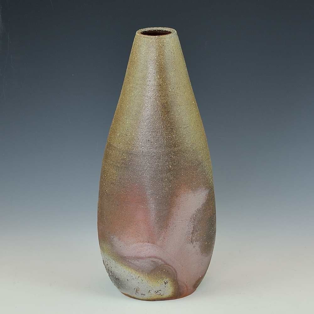 ティアドロップ花入(中)。木村庸祐によってろくろで作られ、作品の底には作家のサインが入っています。登り窯で赤松の割り木だけを使い、約2週間焼き締められました。釉薬は全く使われておらず、土と炎から生み出される自然の色をお楽しみください。花器: 幅約9cm, 奥行約7cm, 高さ約19cm, 備前焼は一点一点手作りのため、焼けや風合いが異なることが多少ございます。どうぞご了承ください。