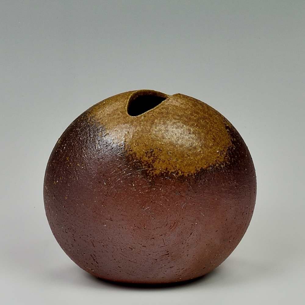 花入-Moon(ミニ)。木村庸祐によって手びねりで作られ、作品の底には作家のサインが入っています。登り窯で赤松の割り木だけを使い、約2週間焼き締められました。釉薬は全く使われておらず、土と炎から生み出される自然の色をお楽しみください。花器: 幅約13cm, 奥行約6cm, 高さ約11cm, 備前焼は一点一点手作りのため、焼けや風合いが異なることが多少ございます。どうぞご了承ください。