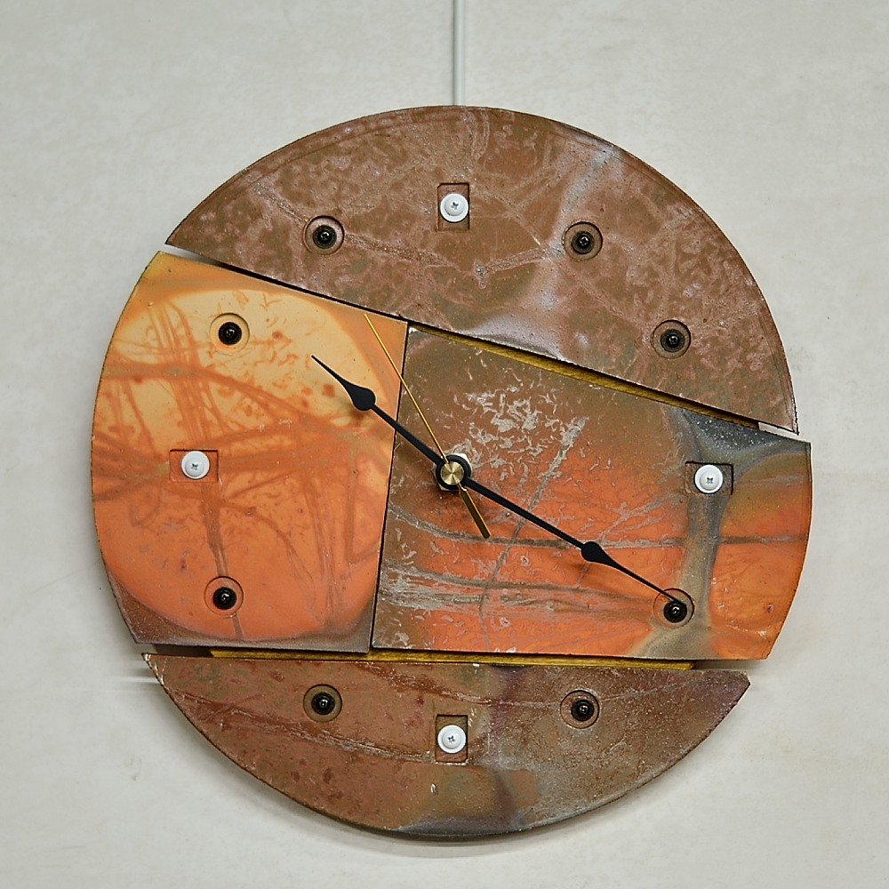 モザイク時計。木村庸祐によって手びねりで作られ、作品の底には作家のサインが入っています。登り窯で赤松の割り木だけを使い、約2週間焼き締められました。釉薬は全く使われておらず、土と炎から生み出される自然の色をお楽しみください。時計: 直径24cm, 高さ約5cm, 備前焼は一点一点手作りのため、焼けや風合いが異なることが多少ございます。どうぞご了承ください。