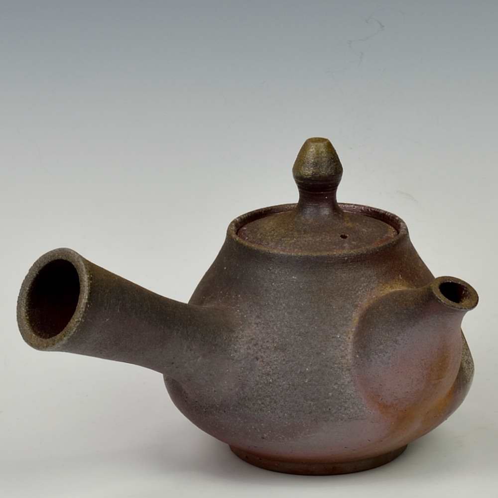 横手急須(左利き用)。木村庸祐によってろくろで作られ、作品の底には作家のサインが入っています。登り窯で赤松の割り木だけを使い、約2週間焼き締められました。釉薬は全く使われておらず、土と炎から生み出される自然の色をお楽しみください。急須: 幅約18cm, 直径11cm, 高さ約12cm, 約360ml 程入ります。備前焼は一点一点手作りのため、焼けや風合いが異なることが多少ございます。どうぞご了承ください。