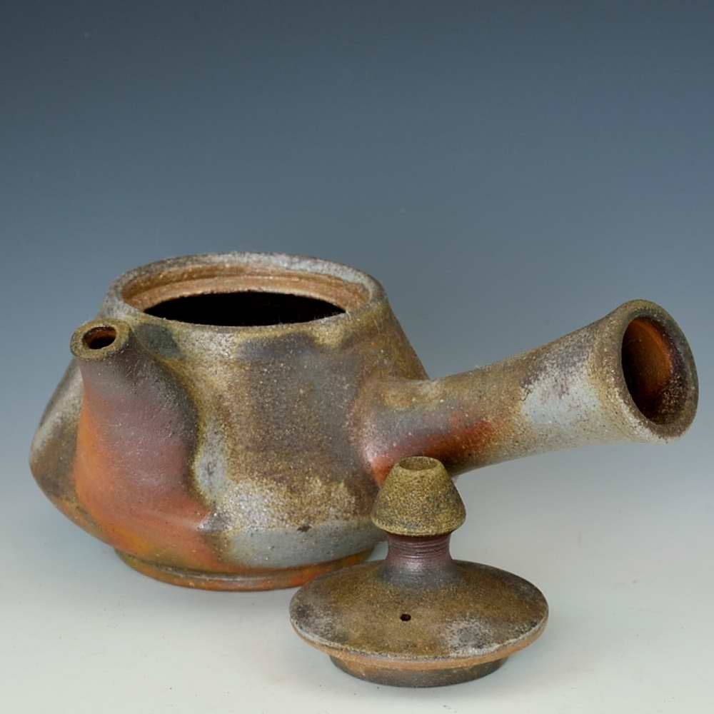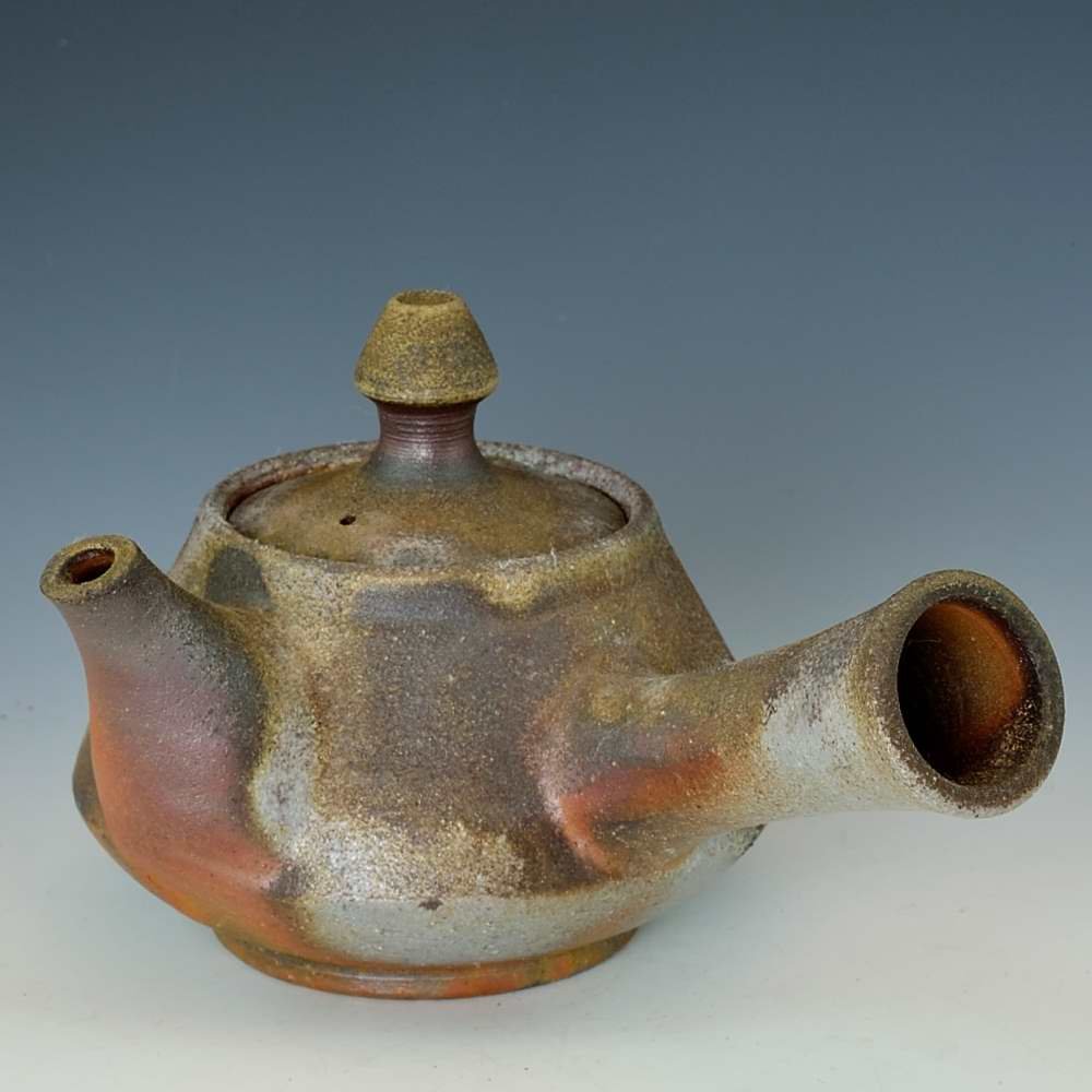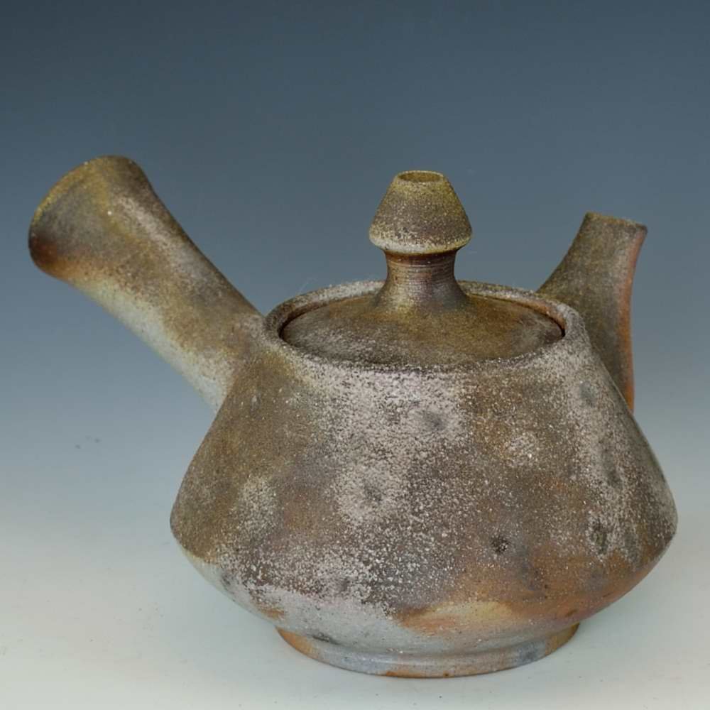 横手急須。木村庸祐によってろくろで作られ、作品の底には作家のサインが入っています。登り窯で赤松の割り木だけを使い、約2週間焼き締められました。釉薬は全く使われておらず、土と炎から生み出される自然の色をお楽しみください。急須: 幅約17cm, 直径10cm, 高さ約10cm, 約250ml 程入ります。備前焼は一点一点手作りのため、焼けや風合いが異なることが多少ございます。どうぞご了承ください。