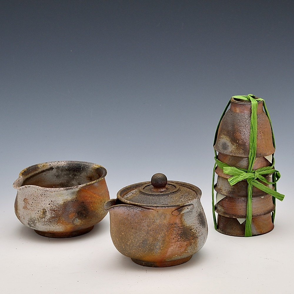煎茶器セット(ろくろ)。木村微風によってろくろで作られ、作品の底には作家のサインが入っています。登り窯で赤松の割り木だけを使い、約2週間焼き締められました。釉薬は全く使われておらず、土と炎から生み出される自然の色をお楽しみください。 煎茶器セット: 幅約20cm, 奥行約12cm, 高さ約17cm, 約180ml 程入ります。 宝瓶、湯冷まし、煎茶碗5つがセットになっています。桐箱付です。 電子レンジ・食器洗浄機対応 備前焼は一点一点手作りのため、焼けや風合いが異なることが多少ございます。どうぞご了承ください。